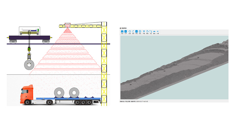 三維掃描是利用激光掃描、視覺成像、高精度云臺(tái)等技術(shù)獲取料堆或汽車的輪廓,生成物料的三維坐標(biāo),指導(dǎo)天車精準(zhǔn)作業(yè)。應(yīng)用場景有汽車掃描識(shí)別、料堆成像。